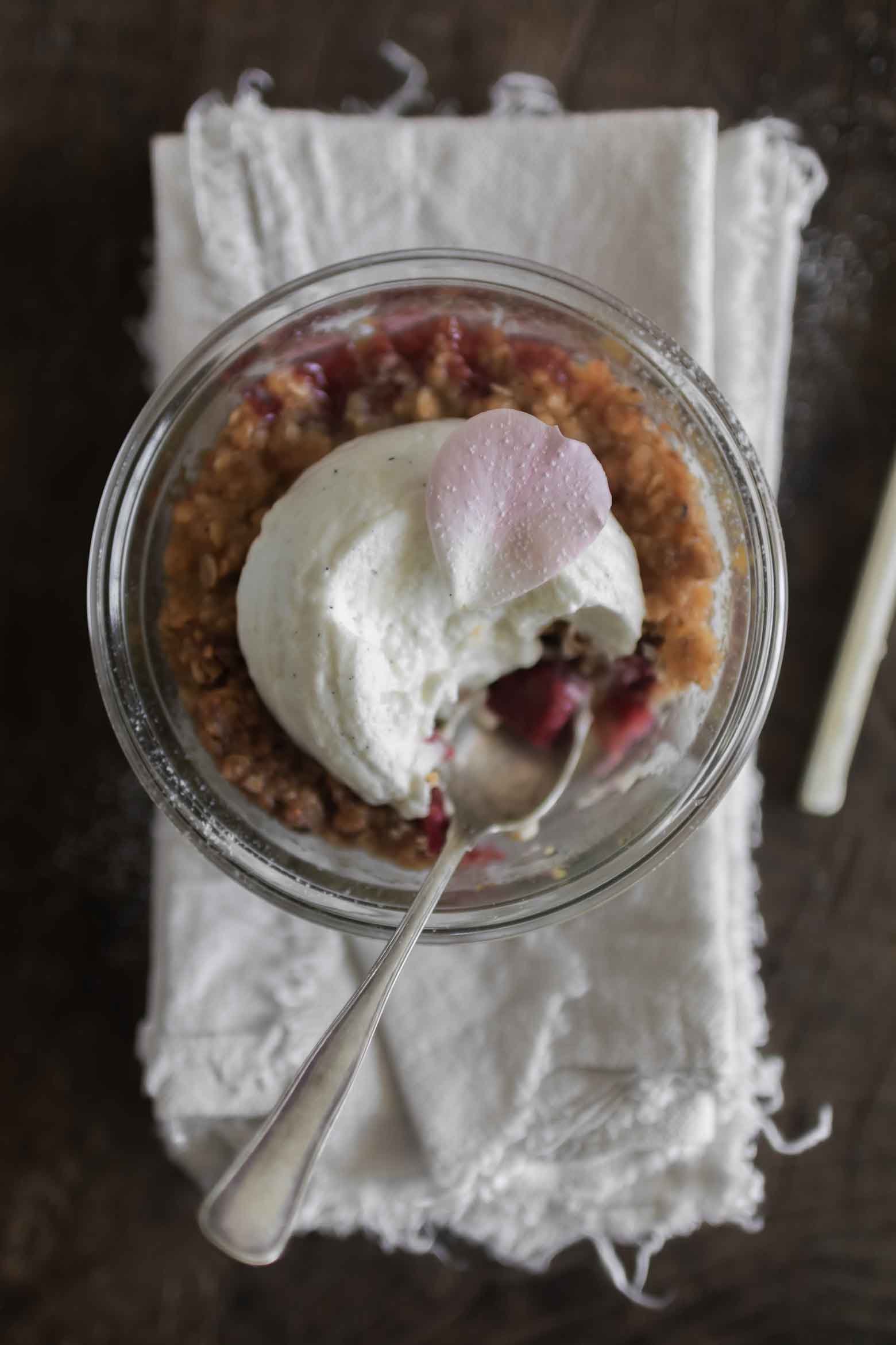 RABARBERCRUMBLE MED HYBENROSE OG CRÈME CHANTILLY
