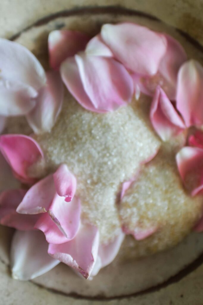 Rosensukker laves ved at blande sukker og blomsterblade, i en fancy blender eller en god, gammel morter.