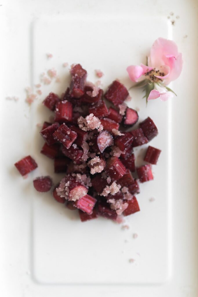 Det bliver til et smukt og aromatisk sukkersmat som nu blandes med rabarber snittet i mundhapsere.